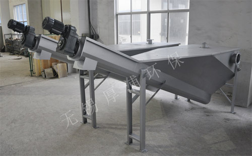 砂水分離器設(shè)備一般螺旋傾角為25~30°之間,砂水混合液從進(jìn)水管進(jìn)入本設(shè)備,混合液通過分離機(jī)上部的聚集箱,在水流的作用下,使混合液的砂粒與有機(jī)物進(jìn)行分離,砂水進(jìn)入集砂槽中,比重較大的顆粒(如砂粒)由于自重而下降,沉積于螺旋槽底部,在螺旋葉片的推動(dòng)下,物料沿斜置的U型槽底部提升,離開液面后,繼續(xù)上移一段距離,砂粒中的水分逐漸在螺旋槽葉片的空隙中流回水箱,砂粒液逐漸干化到出料口處,依靠自重落入其他輸送裝置中,上清液則不斷從排水堰溢流出去,有機(jī)物在水流漩渦的作用下,也跟著上清液從溢流槽流出,回流至污水井中,從而達(dá)到砂水分離的作用。