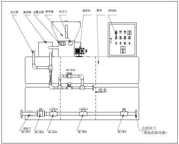 配制溶液從配制槽經(jīng)熟化槽再進(jìn)入儲(chǔ)存槽,當(dāng)儲(chǔ)存槽液位處于高位時(shí),配置過(guò)程自動(dòng)停止,加藥液過(guò)程繼續(xù),當(dāng)溶液下降到中液位時(shí),重新自動(dòng)啟動(dòng)配料過(guò)程。配制槽和熟化槽均設(shè)置攪拌器,充分保證絮凝劑的稀釋和熟化。另外,儲(chǔ)存槽溶液不足時(shí)會(huì)觸及下液位報(bào)警系統(tǒng),所有系統(tǒng)均停止并報(bào)警。本裝置是由具有自動(dòng)化程度高、性能穩(wěn)定、工作可靠、操作簡(jiǎn)單等特點(diǎn)。