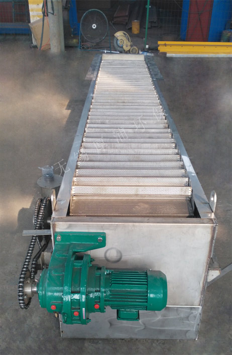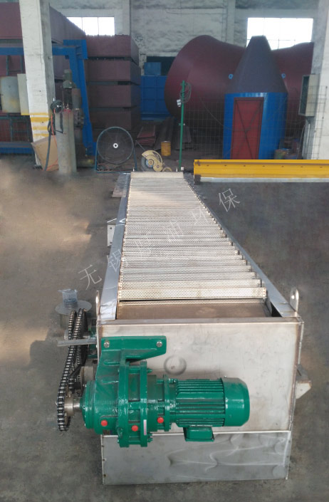 網(wǎng)板式階梯格柵機(jī)能清除漂浮物、纖維物質(zhì),運(yùn)行時(shí)不堵塞雍水,能將柵渣清除干凈。主要由驅(qū)動(dòng)裝置、機(jī)架、傳動(dòng)鏈輪、牽引鏈條、網(wǎng)板及電氣控制柜等主要部件組成。工作時(shí)網(wǎng)板在二側(cè)傳動(dòng)鏈條的帶動(dòng)下,自下而上將整個(gè)渠道寬度范圍內(nèi)的污物向上提取,抵達(dá)上部時(shí),通過鏈輪的轉(zhuǎn)向功能,自動(dòng)完成卸污工作。