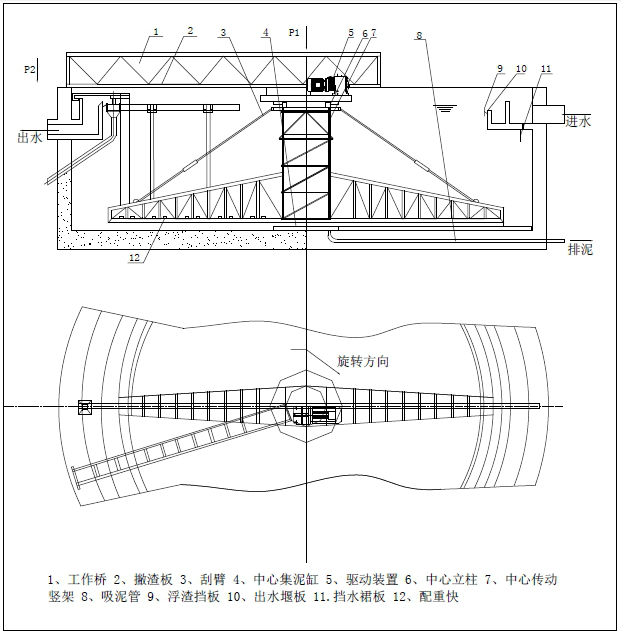該設(shè)備采用中心傳動(dòng)、垂架式,污水進(jìn)入周邊配水槽內(nèi),經(jīng)槽底配水孔均勻流入池內(nèi),并在周邊擋水裙板的作用下,水流從池底流向中心,污泥依靠自重沉積于池底,從而形成泥水分離,驅(qū)動(dòng)裝置驅(qū)動(dòng)中心豎架旋轉(zhuǎn),并帶動(dòng)刮臂及吸泥管旋轉(zhuǎn),在靜水壓力的作用下,污泥均勻地進(jìn)入吸管上布置的吸口,然后通過(guò)中心排泥井的套筒閥排出池外。排泥量的大小可由套筒閥的升降度來(lái)控制,水面的浮渣通過(guò)撇清裝置撇向池邊,再由刮渣耙刮進(jìn)排渣斗內(nèi)排出池外。